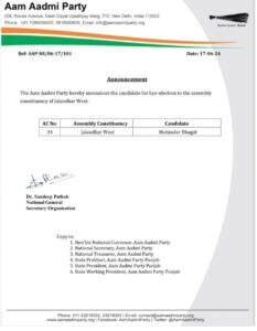 ਜਲੰਧਰ (ਦਾ ਮਿਰਰ ਪੰਜਾਬ)- ਆਮ ਆਦਮੀ ਪਾਰਟੀ ਨੇ ਜਲੰਧਰ ਵੈਸਟ ਤੋਂ ਆਪਣੇ ਉਮੀਦਵਾਰ ਦਾ ਐਲਾਨ ਕਰ ਦਿੱਤਾ ਹੈ ਉਹਨਾਂ ਨੇ ਸਾਬਕਾ ਮੰਤਰੀ ਭਗਤ ਚੂਨੀ ਲਾਲ ਦੇ ਪੁੱਤਰ ਮਹਿੰਦਰ ਭਗਤ ਨੂੰ ਆਪਣਾ ਉਮੀਦਵਾਰ ਐਲਾਨਿਆ ਹੈ।