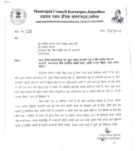 ਜਲੰਧਰ/ਕਰਤਾਰਪੁਰ (ਜਸਪਾਲ ਕੈਂਥ):-ਕਰਤਾਰਪੁਰ ਨਗਰ ਕੌਂਸਲ ਦੇ ਅਧੀਨ ਆਉਂਦੇ ਇਲਾਕੇ ਵਿੱਚ ਸਰਕਾਰੀ ਨਿਯਮਾਂ ਦੀਆਂ ਧੱਜੀਆਂ ਉਡਾਉਂਦੇ ਹੋਏ ਇੱਕ ਗੈਰ-ਕਾਨੂੰਨੀ ਕਲੋਨੀ ਉਸਾਰਨ ਦਾ ਮਾਮਲਾ ਸਾਹਮਣੇ ਆਇਆ ਹੈ। ਪਿੰਡ ਕਾਲਵਾਂ ਰੋਡ, ਜੰਗ-ਏ-ਆਜ਼ਾਦੀ ਯਾਦਗਾਰ ਦੇ ਪਿਛਲੇ ਪਾਸੇ ਲਗਭਗ 5 ਏਕੜ ਜ਼ਮੀਨ ਵਿੱਚ ਕੱਟੀ ਜਾ ਰਹੀ ਇਸ ਕਲੋਨੀ ਵਿਰੁੱਧ ਨਗਰ ਕੌਂਸਲ ਕਰਤਾਰਪੁਰ ਨੇ ਸਖ਼ਤ ਰੁਖ਼ ਅਖਤਿਆਰ ਕਰਦਿਆਂ ਕਲੋਨਾਈਜ਼ਰਾਂ ਨੂੰ ਨੋਟਿਸ ਜਾਰੀ ਕਰ ਦਿੱਤੇ ਹਨ।