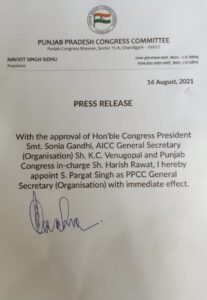 ਚੰਡੀਗੜ੍ਹ( ਦਾ ਮਿਰਰ ਪੰਜਾਬ): ਪੰਜਾਬ ਕਾਂਗਰਸ ਕਮੇਟੀ ਦੇ ਪ੍ਰਧਾਨ ਸ ਨਵਜੋਤ ਸਿੰਘ ਸਿੱਧੂ ਨੇ ਜਲੰਧਰ ਕੈਂਟ ਤੋਂ ਵਧਾਇਕ ਪਰਗਟ ਸਿੰਘ ਨੂੰ ਵੱਡੀ ਜ਼ਿੰਮੇਵਾਰੀ ਸੌਂਪਦਿਆਂ ਸੂਬਾ ਇਕਾਈ ਦਾ ਜਨਰਲ ਸਕੱਤਰ ਲਗਾਇਆ ਗਿਆ। ਟਵਿੱਟਰ ਉੱਤੇ ਜਾਣਕਾਰੀ ਦਿੰਦਿਆਂ ਨਵਜੋਤ ਸਿੱਧੂ ਨੇ ਪਰਗਟ ਦੇ ਨਾਂਅ ਦਾ ਐਲਾਨ ਕੀਤਾ।ਪਾਰਟੀ ਹਾਈਕਮਾਂਡ ਵੱਲੋਂ ਨਿਯੁਕਤੀ ਨੂੰ ਮਨਜ਼ੂਰੀ ਸਿੱਧੂ ਅਤੇ ਉਨ੍ਹਾਂ ਦੇ ਚਾਰ ਕਾਰਜਕਾਰੀ ਪ੍ਰਧਾਨਾਂ ਦੀ ਨਿਯੁਕਤੀ ਦੇ ਕੁਝ ਦਿਨਾਂ ਬਾਅਦ ਆਈ ਹੈ।